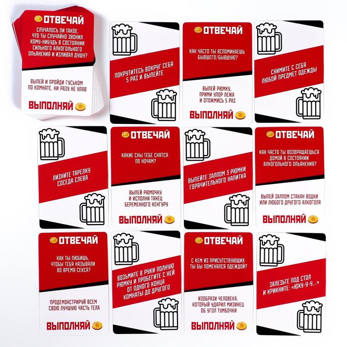 В колоде есть 2 вида карт: одни содержат смешные задания, другие — пикантные вопросы. Отвечать честно или импровизировать, выбирать вам. Главное, чтобы было очень весело!